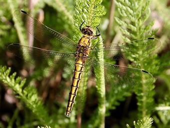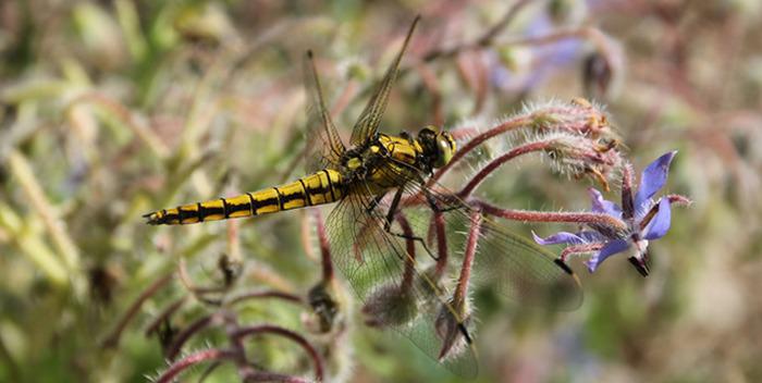 Comme toutes les libellules familières du jardin, l’Orthétrum réticulé (Orthetrum cancellatum) est un patient chasseur à l’affût. Qu’importe le poste d’observation. Dossier d’une chaise, tige de bambou, fleur ou légume… Les ailes rabattues vers l’avant, il est parfaitement immobile. Ou presque. De petits mouvements secs de la tête trahissent en effet son perpétuel qui-vive.