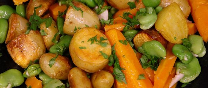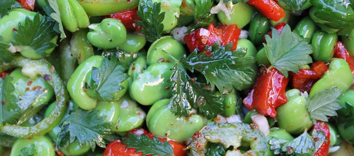 Et puisque nous sommes au printemps, quoi de plus simple et savoureux qu’un bol de fèves fraîches rehaussées de poivrons confits et d’une belle poignée de feuilles de Pimprenelle ciselées ? Avec une vinaigrette relevée d’une pointe d’ail nouveau écrasée et d’un hachis d’oignon blanc. Nouveau également bien sûr.