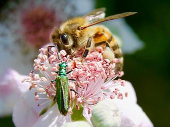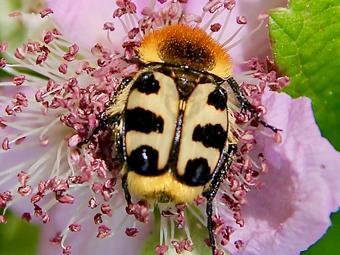 On l’a déjà vue fin mai se repaître de pollen sur les inflorescences du Cornouiller sanguin. Rien d’étonnant donc à ce que la Trichie commune (Trichius zonatus) soit actuellement au rendez-vous des ronciers en fleurs !