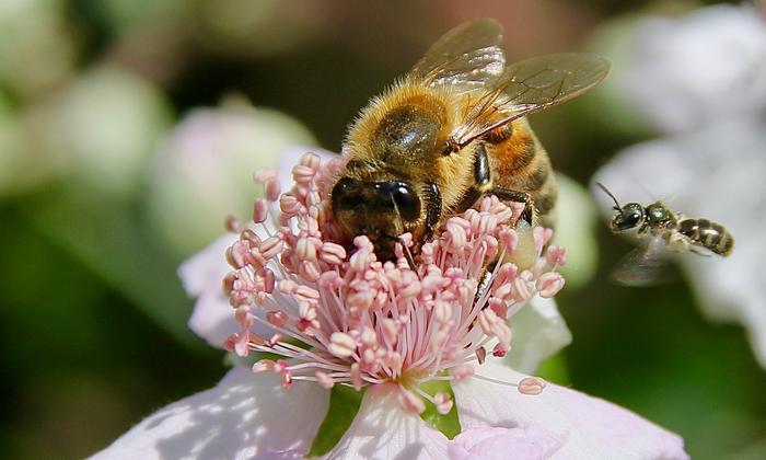 La Ronce commune amorce en effet sa floraison. La concurrence est certes rude actuellement auprès des butineurs. Mais, pour un amateur de pollen, il n’y a pas photo ! Les cinq pétales blanc rosé s’étalent largement, puis se rabattent vers l’arrière, libérant un impressionnant bouquet d’étamines.
