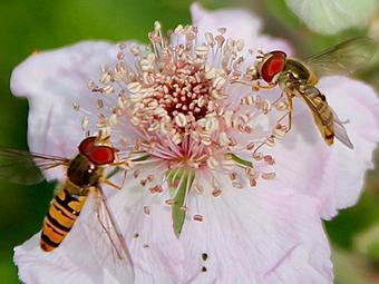 La confiture de mûres, ce sera dans quelques semaines. Syrphes, abeilles et bourdons commencent à y travailler activement dans les haies.