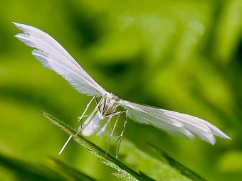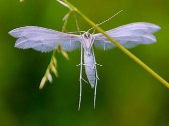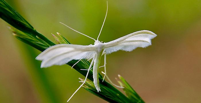 Évidemment, ce ne sont pas de véritables plumes. Le Ptérophore blanc (Pterophorus pentadactylus) est bien un papillon ! Mais les lobes de ses ailes - deux à l’avant, trois à l’arrière - sont joliment « frangés ».