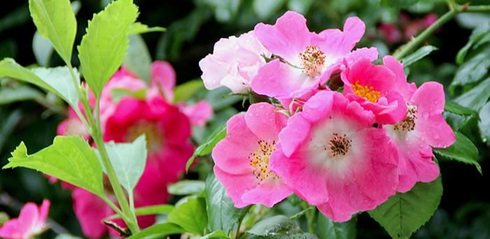 Les cinq larges pétales - plus pâle chez l’églantier véritable - sont ici d’un rose soutenu, mettant d’autant mieux en valeur la forêt d’étamines jaunes. Une splendeur éphémère. Mais constamment renouvelée. Par grappes, de nouveaux boutons sont déjà prêts à prendre le relais.
