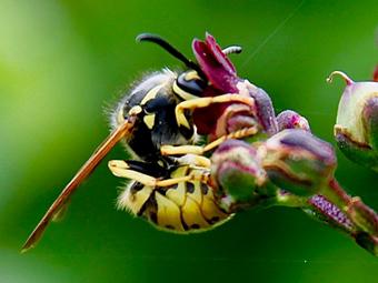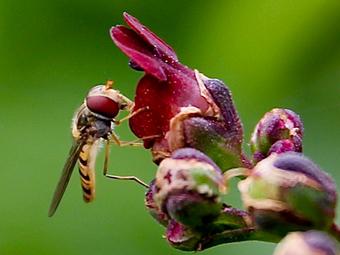 Du plus gros au plus petit, ils semblent apprécier. Qui le nectar. Qui le pollen. Avec plus ou moins de délicatesse. L’avidité de la guêpe paraît ainsi disproportionnée au regard de la minuscule fleur. Elle s’y agrippe fermement, la tête plongée sous la « casquette » rouge. Le Syrphe est plus subtil. Il se régale en prenant tout juste appui du bout de pattes.
