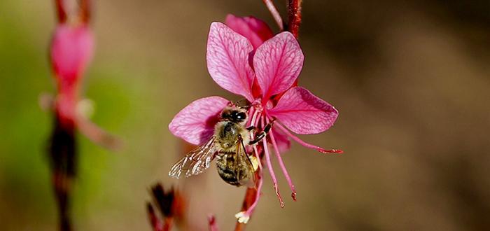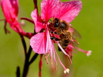 D’ailleurs, nombre d’abeilles filent directement au centre du dispositif, vers l’entrée du tube nectarifère, sans même toucher au faisceau d’étamines. Qu’importe. À vrai dire le Gaura ne compte pas vraiment sur elles.