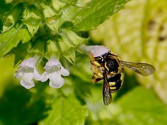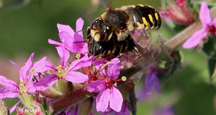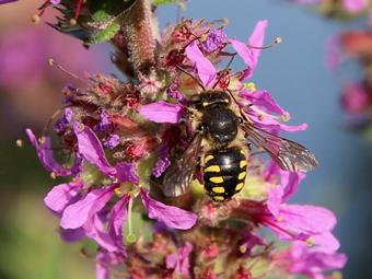 Il faut montrer pattes avant noires et jaunes pour espérer profiter de la manne des petites fleurs pourpres. Mais pas seulement. Encore faut-il avoir les ailes fumées, deux petits points jaunes à l’arrière de la tête et dix bandes jaune vif dessinant un grand V sur le fond noir de l’abdomen. Ah, encore une précision : les deux bandes antérieures doivent impérativement former comme une « virgule » décalée et descendre plus bas sur les côtés que les suivantes. Bref, il faut être ici une Anthidie septemspinosum ! Excusez du peu.