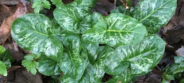 Tout a commencé en décembre pour l’Arum d’Italie (Arum italicum). Au bord des haies. Avec un superbe feuillage sagitté au vert profond veiné de blanc crème.