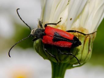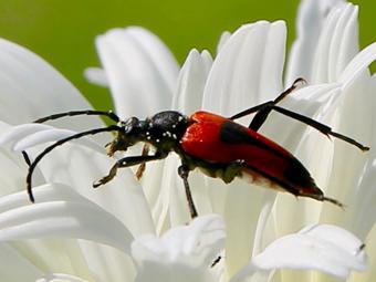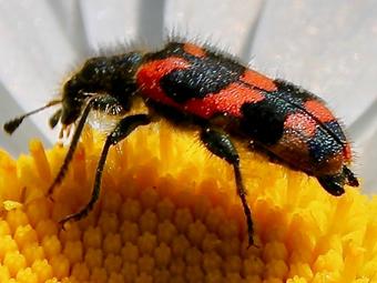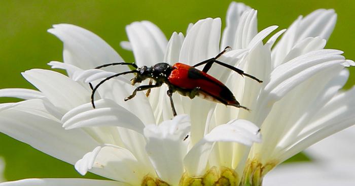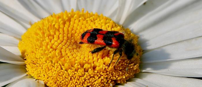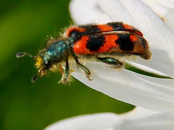 Les grandes marguerites blanches du jardin ont actuellement beaucoup de succès auprès des amateurs de pollen et de nectar. Le Clairon des ruches (Trichodes alvearius) n’est pas le dernier. Très velu, notamment sur le thorax verdâtre, ce coléoptère se reconnaît aisément à ses élytres rouges barrés de noir.