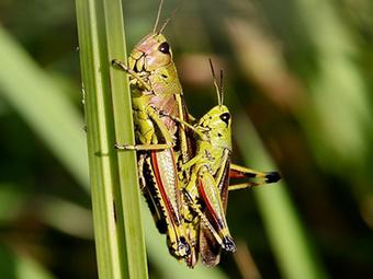 Sans rivaliser avec ce gringalet de Monsieur Thomise variable, le Criquet ensanglanté mâle est nettement plus petit que la femelle. À moins que ce soit elle qui soit plus gironde.