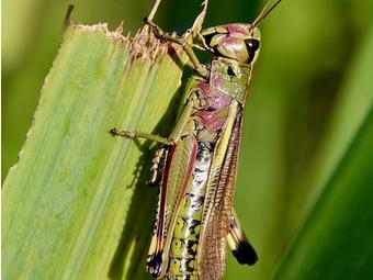 Ensanglanté ? Si la femelle est parfois maculée de taches pourpres, c’est loin d’être une généralité. Du moins observe-t-on a minima, d’un individu l’autre, une ligne rouge vif en bordure de la « cuisse » postérieure. Le tibia arrière est lui plutôt jaune, ponctué d’épines noires. Le reste au corps est à dominante verdâtre. Avec des nuances jaunes sur la face ventrale, des marbrures noires sur l’abdomen. Et, bien sûr, les deux courtes antennes propres aux criquets.