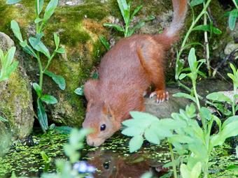L’écureuil est tout aussi indifférent aux gesticulations des ados. Il vient là régulièrement entre deux cabrioles et prend tout son temps pour se désaltérer. De quoi encourager les passereaux. Néanmoins prudent, le verdier se faufile parmi les touffes de myosotis pour accéder discrètement à l’eau. La fauvette à tête noire est plus téméraire. Au diable ces balourds de merleaux !