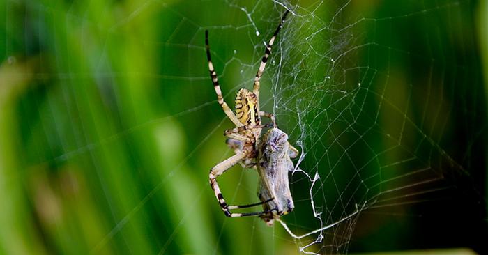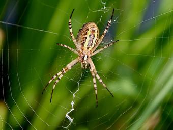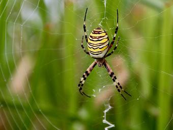 Ah çà ! On ne risque pas de la confondre. L’Épeire fasciée (Argiope bruennichi) présente un abdomen particulièrement replet. Du moins la femelle. Le mâle est un peu plus fluet. Mais l’un et l’autre présentent le même jeu de bandes jaune vif et blanches animées de lignes noires. Ce graphisme éclatant lui vaut nombre de sobriquets. Araignée guêpe ou frelon notamment.