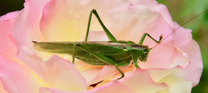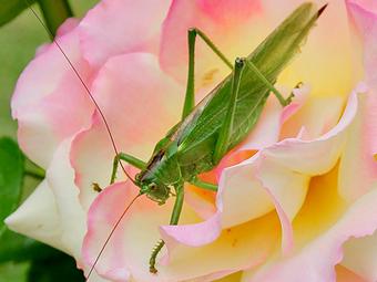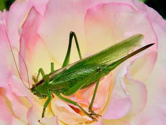 Elle ne pouvait choisir plus bel écrin au jardin. Tant pis pour l’homochromie dont la Grande sauterelle verte (Tettigonia viridissima) est familière dans l’herbe des allées et parmi les légumes du potager ! Postée au cœur d’une rose, elle est quasi immobile. Hormis ses très longues antennes brunes. Aux aguets.