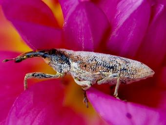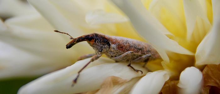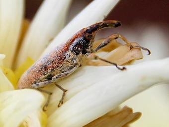 La famille des charançons est extrêmement nombreuse. Et n’a pas vraiment bonne réputation. Celui-ci visite les fleurs de dahlia du jardin. Est-ce pour mieux cacher son jeu ? Il fait en effet penser au Lixus de la betterave. Mais la planche desdites betteraves est indemne. Ouf ! Plutôt le Lixus poudreux (Lixus pulverulentus) alors. Encore que l’examen n’en soit pas simple.