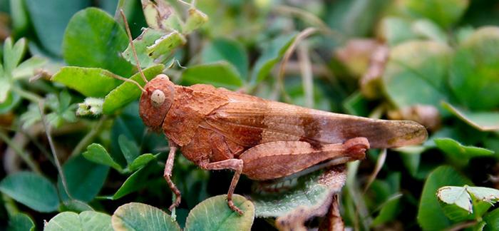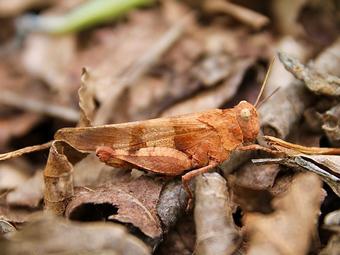 On est plus habitué à le voir - ou plutôt l’apercevoir - dans sa version gris-bleu. L’Oedipode turquoise ((Oedipoda caerulescens), champion du camouflage, arbore ici une tenue un peu plus vive. Fauve. Presque orangée. L’homochromie fonctionne malgré tout très bien lorsqu’il reste tapi sur le paillis de feuilles mortes du potager. Mais, évidemment, la magie se dissipe dès qu’il s’aventure sur le trèfle encore à peu près vert des allées.