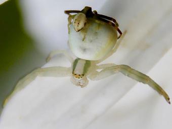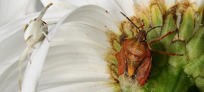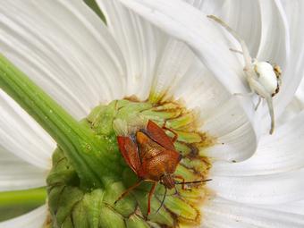 Il serait passé inaperçu sous les pétales d’une marguerite sans l’étrange comportement d’une Thomise variable. D’ordinaire si prompte à sauter sur tout ce qui bouge, « l’araignée-crabe » semble là aussi excitée qu’hésitante. J’y vais, j’y vais pas ? Il est vrai que ce n’est pas le moment. Sur le dos de la belle, un mâle explore en effet le volumineux abdomen, bien décidé à en percer le mystère.