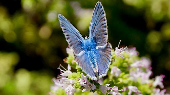 Changement complet de décor quand l’un et l’autre ouvrent les ailes. Les lunules orangées sont toujours là chez la femelle mais sur un fond uniformément brun foncé. Elles ont disparu chez le mâle au profit d’une éblouissante marbrure bleue violacée.