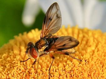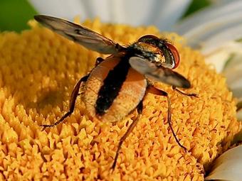 Encore une mouche aussi jolie qu’utile au jardin. Bien en harmonie avec le cœur jaune des marguerites qu’elle fréquente assidument ! La Phasie crassipenne (Ectophasia crassipennis) présente au moins deux signes distinctifs facilement identifiables. D’abord ses ailes fumées, fortement nervurées, tachées de noir, le plus souvent relevées à 45° lorsqu’elle butine. Et surtout son abdomen, large et plat, jaune d’or, marqué d’une épaisse bande médiane noire.