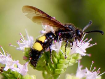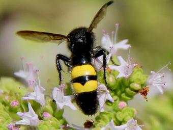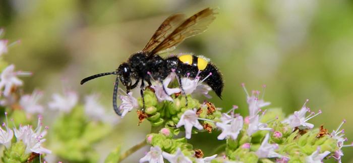 Dans la série des guêpes solitaires utiles au jardin, voici la Scolie hirsute (Scolia hirta). Elle est immédiatement repérable lorsqu’elle butine. Ici sur l’origan en fleurs. Grâce à sa taille respectable, mais surtout aux deux larges bandes jaune vif qui barrent son abdomen. Les ailes fumées, elle se distingue encore, d’où son qualificatif, à la pilosité dense qui brille au soleil sur l’ensemble du corps.