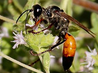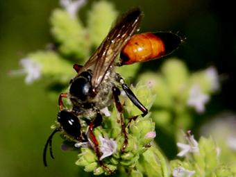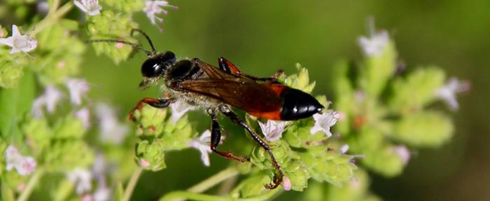 Dans l’effervescence de l’origan en fleurs, parmi abeilles et papillons, voici une grosse guêpe qui n’est pas sans rappeler l’Isodonte mexicaine. À plus d’un titre ! Comme son qualificatif le suggère, le Sphex gryllivore (Sphex funerarius) chasse en effet grillons et sauterelles. Non pour sa consommation personnelle. Il préfère le nectar et le pollen des fleurs. Mais pour ses larves.