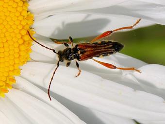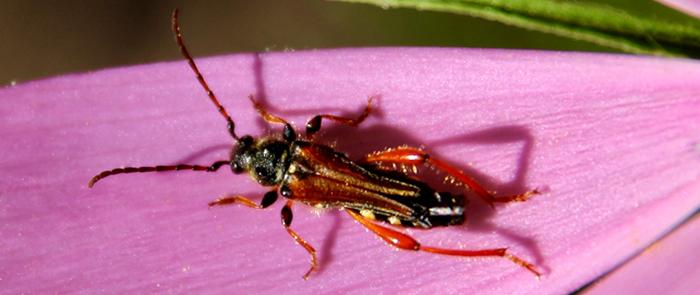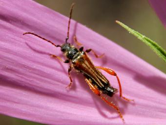Parmi les petits coléoptères des massifs fleuris du jardin, le Sténoptère roux (Stenopterus rufus) se distingue au premier coup d’œil. Par sa dominante rousse bien sûr. Mais aussi par les renflements de ses fémurs. Et pas uniquement sur les pattes arrière du seul mâle comme chez l’Oedémère noble.