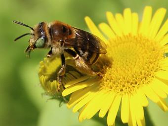 Être abeille solitaire ne l’empêche pas de communiquer et de partager les bons filons. Elles sont en effet ici une bonne dizaine au rendez-vous des boutons jaune orangé de la Pulicaire sur les bords de Sèvre.