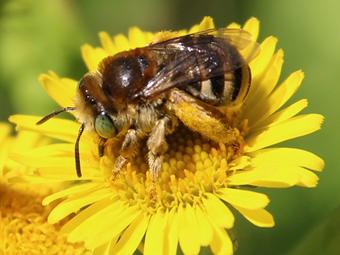 Une toute petite abeille sauvage. On ne sait trop ce qui frappe le plus. De ses grands yeux verts ou de la dense pilosité de ses tibias arrière ? De véritables pièges à pollen ! La belle est difficile à identifier. Peut-être l’Anthophore bimaculata, cousine de l’Anthophore plumeuse rencontrée au printemps sur le romarin en fleurs.
