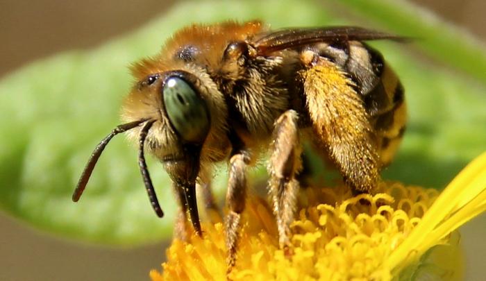 Outre les yeux émeraude tachés de noir, la petite troupe partage la même abondante fourrure. Roussâtre sur le dessus de la tête et du thorax. Plutôt beige sur les côtés et sur la face. Beige encore pour les rayures de l’abdomen courtaud. Et pour les tibias bien sûr. Quand le pollen de la pulicaire ne les a pas poudrés d’or !
