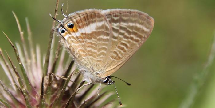 Oh, évidemment, l’appendice en question fait un peu riquiqui au regard du majestueux Flambé ! Un simple petit fil flottant au vent à l’arrière de chaque aile postérieure. Bleu, noir, blanc. L’attribut de l’Azuré porte-queue (Lampides boeticus) n’en est pas moins joliment mis en scène. Il émerge ainsi entre deux grands « yeux » orangés aux larges pupilles noires soulignées de bleu.