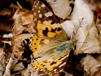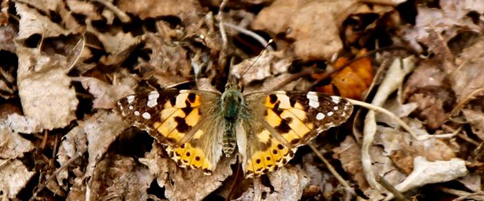 Ce matin, la Belle-Dame (Cynthia cardui) semble vouloir prendre un bain de soleil incognito. Elle fait ainsi halte sur le paillis du potager. Sa livrée, un peu passée, il est vrai, s’y fond dans les contrastes mordorés des feuilles mortes.