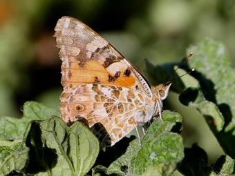 Lorsqu’elle s’envole, boudant les fleurs, c’est pour se reposer sur une feuille de tomate. Les ailes vite repliées. Paradoxalement, sa poste favorite de camouflage est là presque plus voyante. L’orangé des antérieures ressort en effet davantage. Apparemment plus sobres, les postérieures jouent de multiples nuances beiges, brunes et fauves que souligne un fin réseau de lignes blanches. Quatre petits ocelles pointés de noir parachèvent ce décor finalement très structuré.