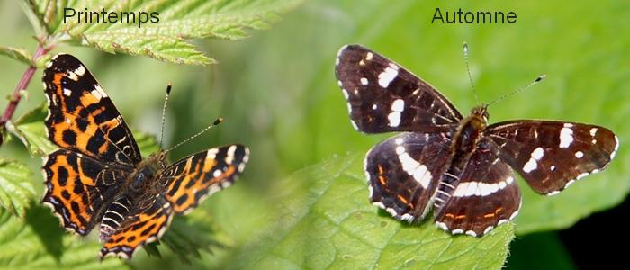 Seules constantes : l’abdomen noir finement rayé de blanc et le revers des ailes. Fauve aux reflets rougeoyants en cette saison. Barré de blanc et de noir, il présente comme au printemps ce réseau de lignes claires qui lui valent son nom populaire. L’appellation latine (Araschnia) évoque davantage la toile d’araignée. Mais, à quelques jours de la rentrée scolaire, va pour la carte de géo !