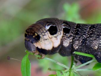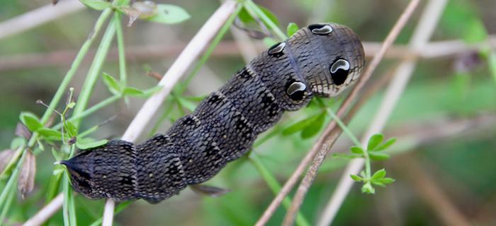 Impressionnante ! Sept bons centimètres. Un corps noirâtre replet. Des lignes de petites tâches beiges et bleutées. On jurerait des écailles. Pour parfaire l’illusion du serpent, la chenille se tortille, se balance de droite et de gauche au moindre dérangement.