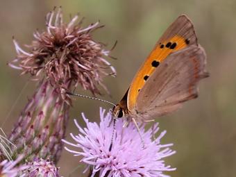 Il illuminera le jardin quasi jusqu’aux premières gelées. Trois générations de Cuivré commun (Lycaena phlaeas) se succèdent tout l’été et une partie de l’automne. Les petites chenilles de la dernière se camoufleront aux temps mauvais. Elles reprendront des forces au printemps sur les jeunes pousses d’oseille sauvage.
