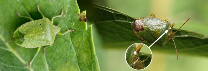 On a vu ce printemps comment la petite mouche Trichopoda pennipes se taille une solide réputation en parasitant la Punaise verte ponctuée (Nazara viridula). D’accord, mais pourquoi « ponctuée » et quelle différence avec la punaise verte « ordinaire » (Palomena prasina) ?