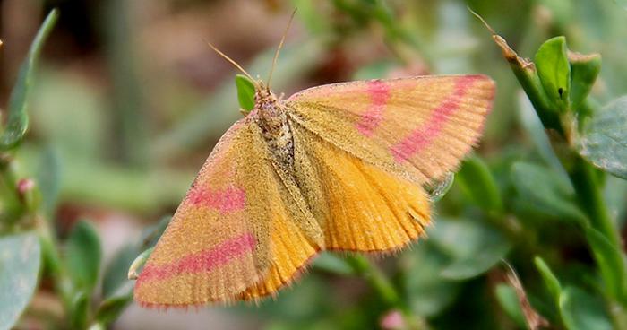 De la mythologie grecque au jardin, il n’y a qu’un pas avec la Timandre aimée (Timandra comae). Cela dit, inutile de trop disserter sur la vie tumultueuse de la fille de Tyndare et Léda puisque, dans leur grande sagesse, les entomologistes l’ont résumée en un qualificatif attendrissant. Et comment ne pas l’aimer en effet ce discret papillon de nuit, original tant par la forme que par la délicate harmonie de ses couleurs ?