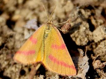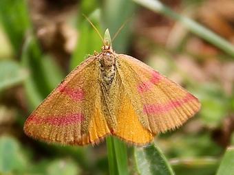 Voilà a priori un petit papillon de seconde génération. Les bandes pourpres violacées de l’Ensanglantée de l’oseille (Lythria cruentaria), envahissantes chez les individus printaniers, sont ici beaucoup plus étroites. Elles barrent le fond fauve des ailes antérieures. Les postérieures sont d’un jaune orangé plus franc et immaculé. Hormis une frange dont le pourpre vire au brunâtre.