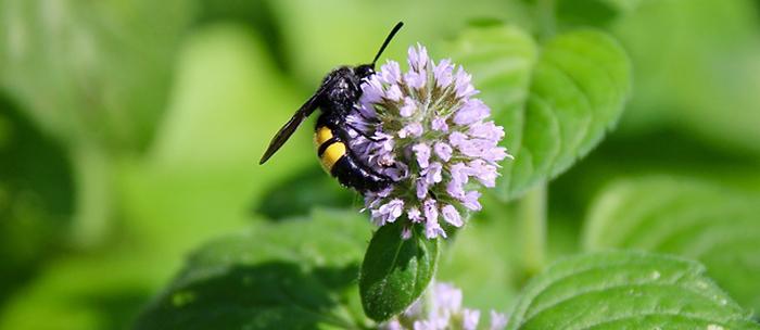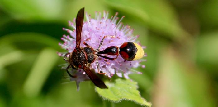 La plus grosse des guêpes maçonnes. De l’envergure d’un frelon. Pas de panique cependant. L’Eumène unguiculé (Delta unguiculatum) est aussi pacifique qu’impressionnant. Il se laisse volontiers photographier, trop occupé ici à butiner la Menthe sauvage.