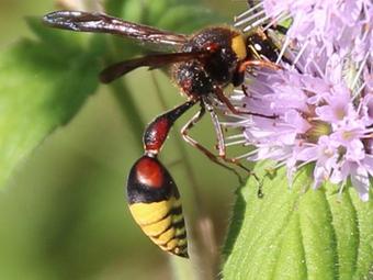 Sa silhouette évoque bien sûr la petite Guêpe potière (Eumenes pomiformis) mais en taille XXL ! Comme elle, son abdomen effilé présente un premier renflement, avant de l’épanouir en forme de poire à l’extrémité envahie de jaune. Outre le gabarit bien sûr, il s’en distingue par de larges taches rouges de part et d’autre de l’étranglement. Un rouge plutôt bordeaux qui vient également discrètement animer le thorax finement velu et l’attache des ailes fumées.