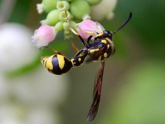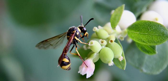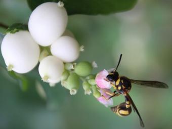 Peut-être les capsules vertes et surtout les boules blanches de la Symphorine rappellent-elles des souvenirs à la Guêpe potière (Eunemes pomiformis). Elles ressemblent un peu en effet aux petits pots de terre mêlée de salive qu’elle façonne pour installer sa progéniture.