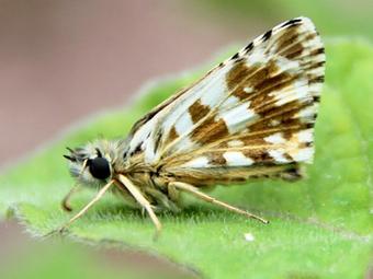 On peine à croire qu’il s’agisse du même petit papillon. En pause sur une feuille de Coqueret du Pérou, l’Hespérie des potentilles (Pyrgus armoricanus) est plutôt lumineuse. Fortement nervurées, ses ailes repliées mêlent ainsi un blanc verdâtre à de larges marbrures brun clair nuancé de jaune. Comme la Sylvaine, sa cousine, elle arbore de grands yeux noirs qui tranchent ici sur une petite tête à la fourrure blanchâtre.