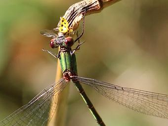 Comme ses cousines, libellules ou demoiselles, il est en chasse permanente. On l’aperçoit ainsi lors de brefs affûts sur une feuille ou la tige d’une graminée. Mais c’est en vol qu’il capture ses proies. En particulier les petites mouches. À ce titre, c’est un plutôt bon auxiliaire au potager. Cela ne l’a empêché pas ici de jeter son dévolu sur une petite coccinelle jaune. Revenu à son poste d’observation, il la décortique goulument de ses puissantes mandibules. En laissant ailes et élytres de côté.