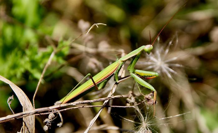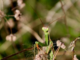 L’élégante Mante religieuse (Mantis religiosa) est à l’affût parmi les hautes herbes en bord de haie. D’une taille impressionnante, six bons centimètres, elle est pourtant d’allure fluette. Un mâle sans doute.