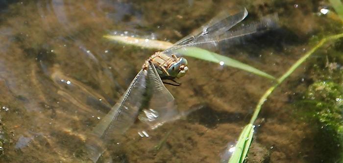 Quoi qu’il en soit, l’affût du premier est ici très particulier. L’accouplement vient d’avoir lieu. Pas question qu’un concurrent importune sa belle pendant la ponte. Il pourchasse ainsi farouchement les intrus pendant que Madame, à dominante jaune, zigzague à fleur d’eau et, toujours en vol, y plonge l’abdomen pour déposer ses œufs. Ici et là. Le fossé est peu profond et grouille de larves en tous genres. Celles de l’Orthétrum bleuissant ne tarderont pas à s’en repaître.