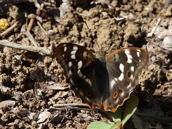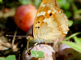 Depuis quelques jours, son menu est plus « convenable » au jardin. On l’y trouve ainsi régulièrement sous le mirabellier où le jus sucré des prunes à terre semble le réjouir. Il choisit les mirabelles les plus blettes, dont la queue est tombée, et y plonge sa trompe avec délectation. Mais le plus surprenant est dans la couleur de ses ailes. Le Petit mars changeant présente en effet deux aspects différents : dessus brun foncé avec taches blanches et ocelles orangés pour la forme Apatura ilia ilia, même décor, mais dans une dominante fauve pour la forme Apatura ilia clytie. Et comme si cela ne suffisait pas, l’une et l’autre se parent de reflets bleutés selon l’orientation du soleil.