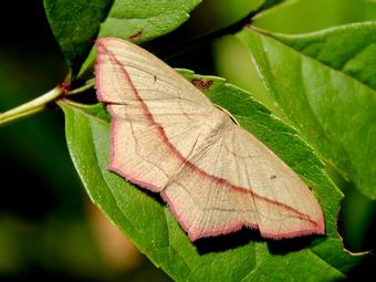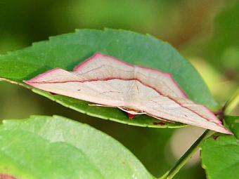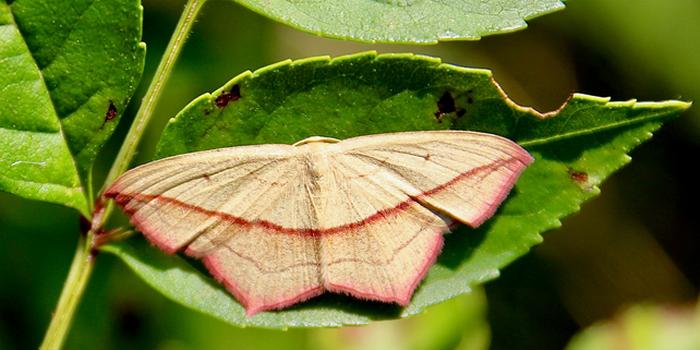 Des ailes anguleuses frangées de rose vif, une large ligne courbe et rousse barrant les antérieures en diagonale et les postérieures à l’horizontale, le tout sur fond brun clair et pointillé. Un décor somme toute très sobre.