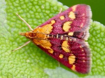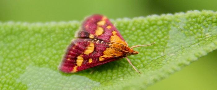 Son nom de famille fait frémir tout jardinier. La Pyrale pourprée (Pyrausta purpuralis) a beau être jolie, elle n’en compte pas moins au nombre des ravageurs du potager. Encore qu’elle ait des goûts de luxe et se limite aux plantes aromatiques. Particulièrement la menthe. Au jardin comme dans les champs. Elle fait une pause ici sur une feuille de sauge.