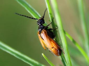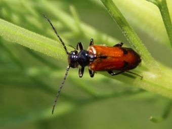 Sitôt l’éclosion, les larves du petit coléoptère aux courts et étroits élytres orangés font preuve d’une remarquable cohésion. Elles forment, ensemble, une petite boule compacte qui pend généralement à la branche où elles sont nées. Le « collectif » émet alors des phéromones propres à séduire les abeilles sauvages mâles alentour. Le temps de réaliser la méprise, les malheureux sont déjà investis par quelques larves accrochées à leur fourrure. Le transfert sur une abeille femelle a lieu lors d’une copulation en bonne et due forme. Reste alors aux larves de la Stenoria analis à se laisser conduire vers le terrier. Et à s’y gorger de miel.