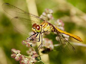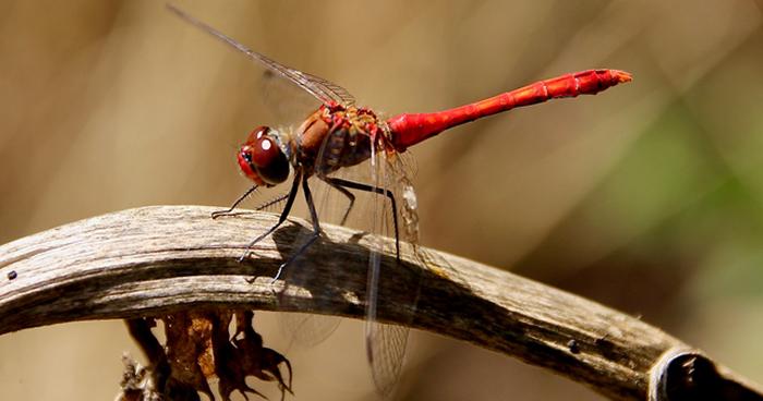D’assez petite taille, ce n’est pas la libellule la plus spectaculaire du jardin. Sinon par la couleur vive du mâle. Le Sympétrum rouge sang (Sympetrum sanguineum) ne prête guère à confusion. Avec ses pattes entièrement noires, son abdomen à l’extrémité enflée et marquée de deux traits noirs sur le dessus.