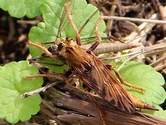 Pattes jaunâtres et tarses roux, ailes fumées marquées d’une large ligne sombre, le Chrysotoxe intermédiaire apprécie les bains de soleil. Dans la famille, les larves se développent dans le bois pourri, mais également dans la terre du potager. Elles y traquent les pucerons des racines. Notamment celles des carottes.